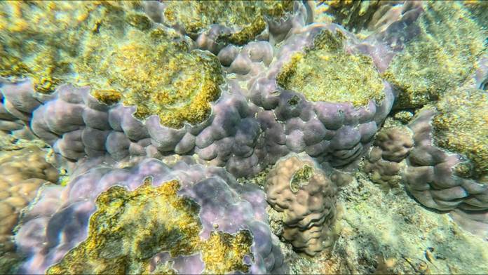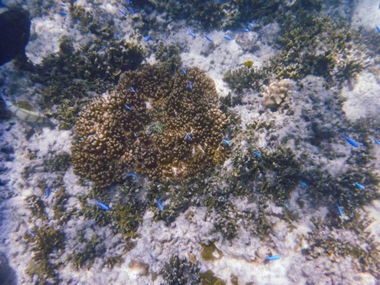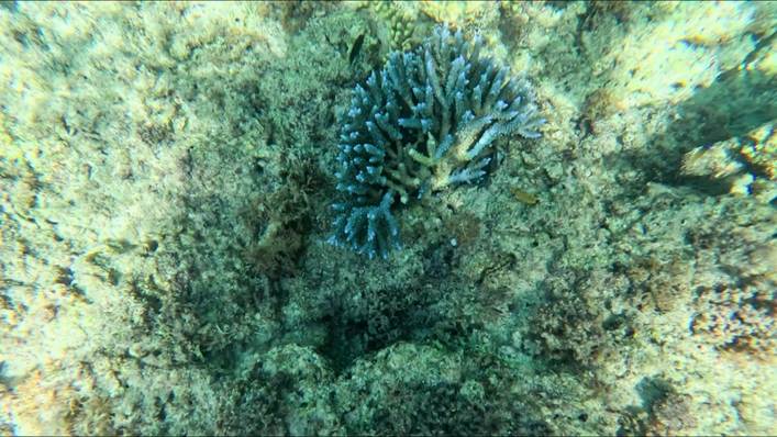 今回,特に目についた青いサンゴの生育 |