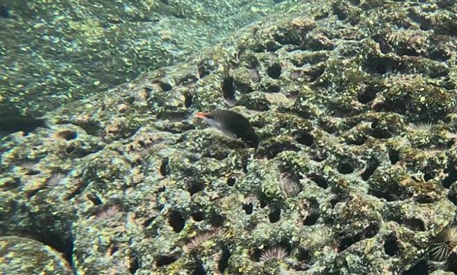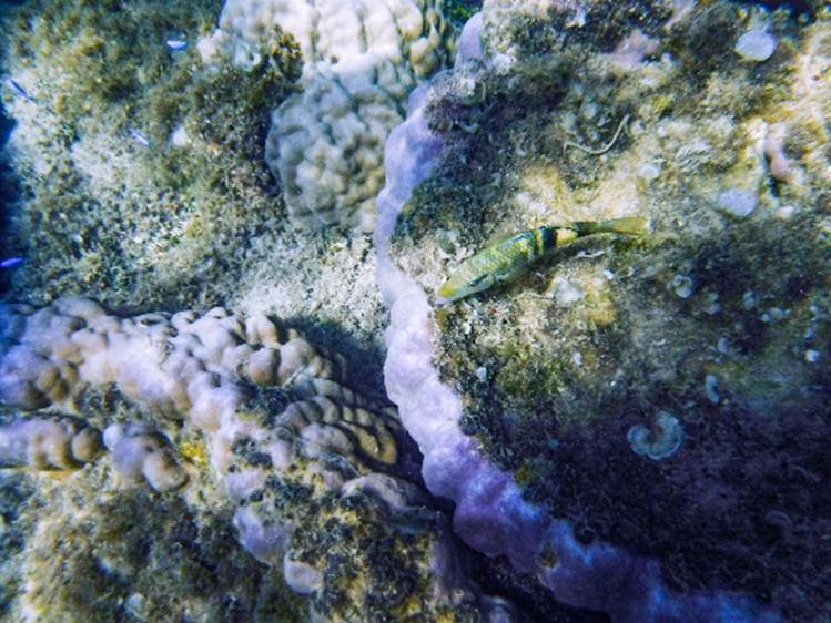 ハワイ島名物のキイロハギ Bird wrasseの個体。サンゴは岩のように形成され穴にウニがいる |