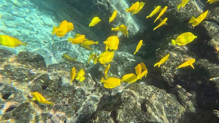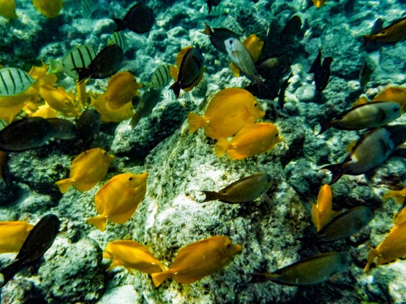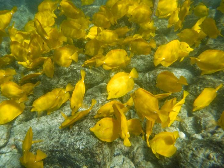 イエローフィッシュ(キイロハギ)とよばれるハワイに多い魚が浅いところに群れてる。 |