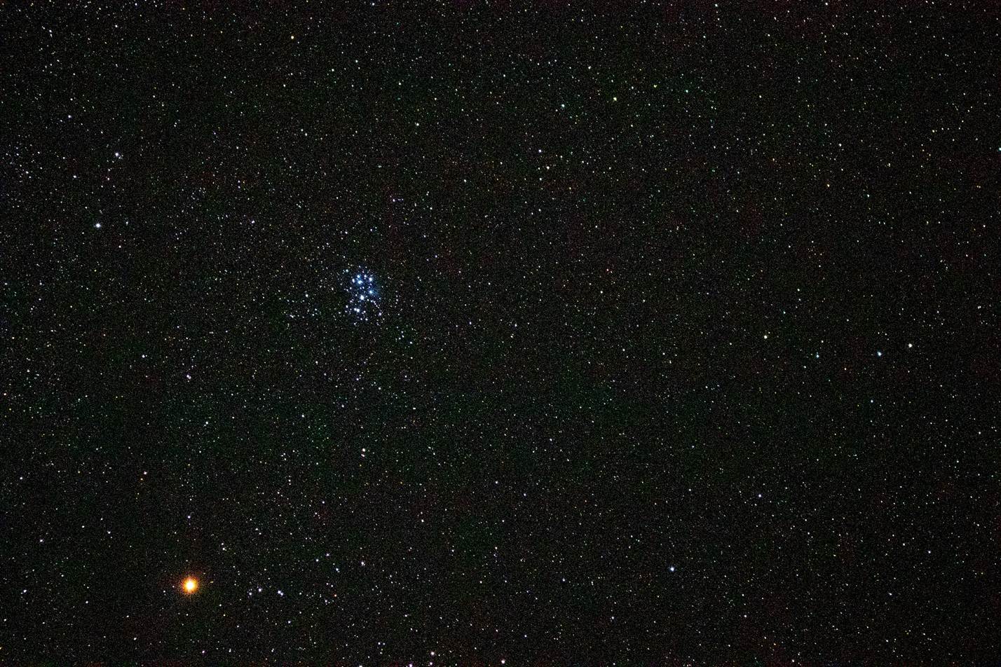 プレアデス星団と火星Cannon ESO M100 f6.3 45mm 露出30秒 ISO 6400